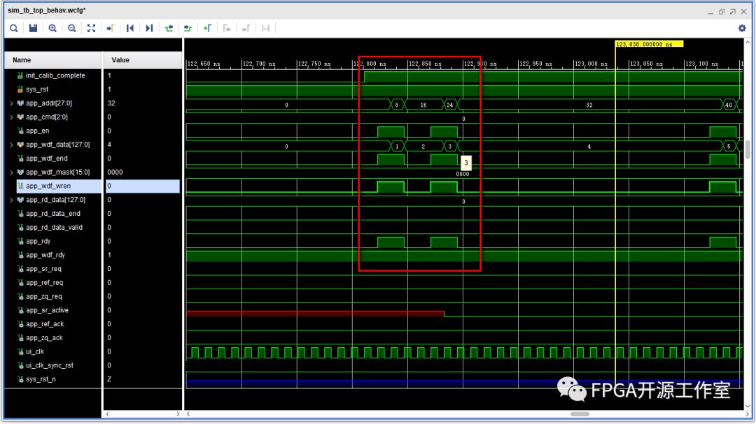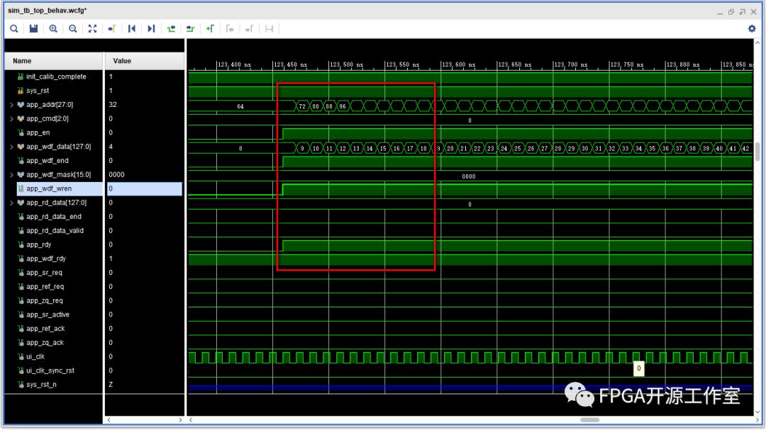 如圖紅框所示,我們采用寫時序第一種情況(具體參看《第三篇:mig IP用戶讀寫時序》)。地址每次加8,數(shù)據(jù)每次加1。