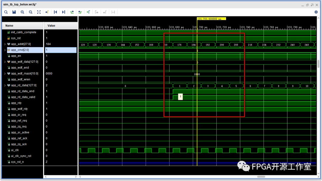 如上圖紅框所示,app_rd_data_valid信號有效,讀出數(shù)據(jù)和寫入數(shù)據(jù)一致,仿真驗證完成。