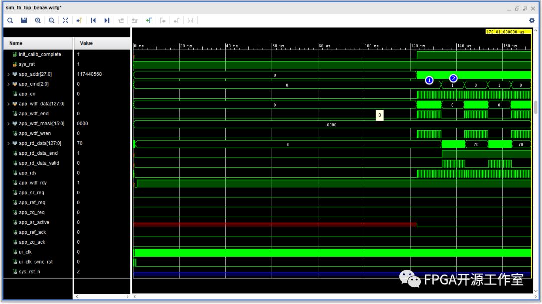 如上圖所示,app_cmd信號在①處為寫ddr3命令,從bank0寫到bank7。②處為ddr3讀命令,從bank0讀到bank7。