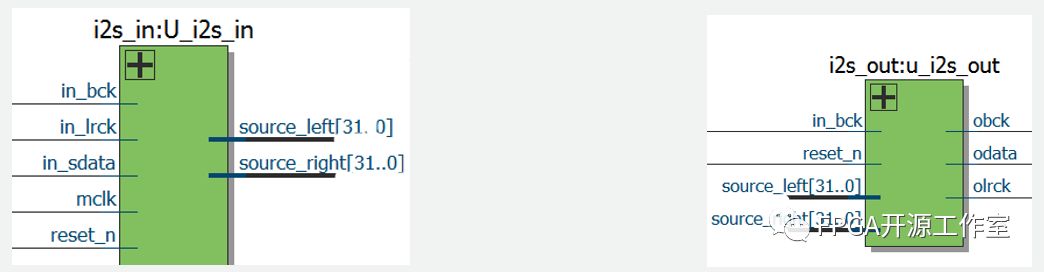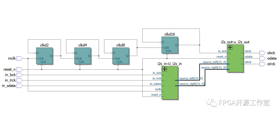 i2s_test模塊為i2s_in和i2s_out模塊的頂層,i2s_in模塊將輸入的串行數(shù)據(jù)轉(zhuǎn)換成并行的數(shù)據(jù),然后i2s_out模塊將并行數(shù)據(jù)轉(zhuǎn)換成串行數(shù)據(jù)輸出。