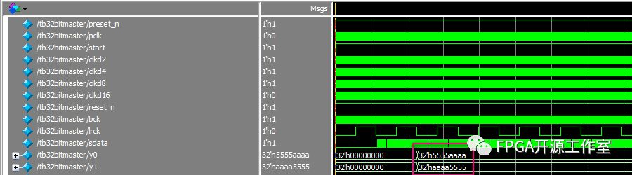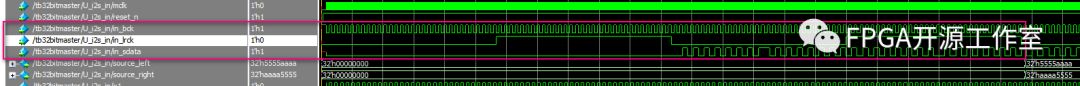 讓i2s_out模塊將并行轉(zhuǎn)為串行,然后使用i2s_in模塊將串行轉(zhuǎn)為并行。驗證數(shù)據(jù)是否正確。