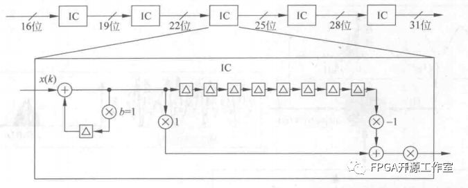 積分器和梳狀濾波器的級(jí)聯(lián)就是積分梳狀(Integrator-Comb)濾波器。