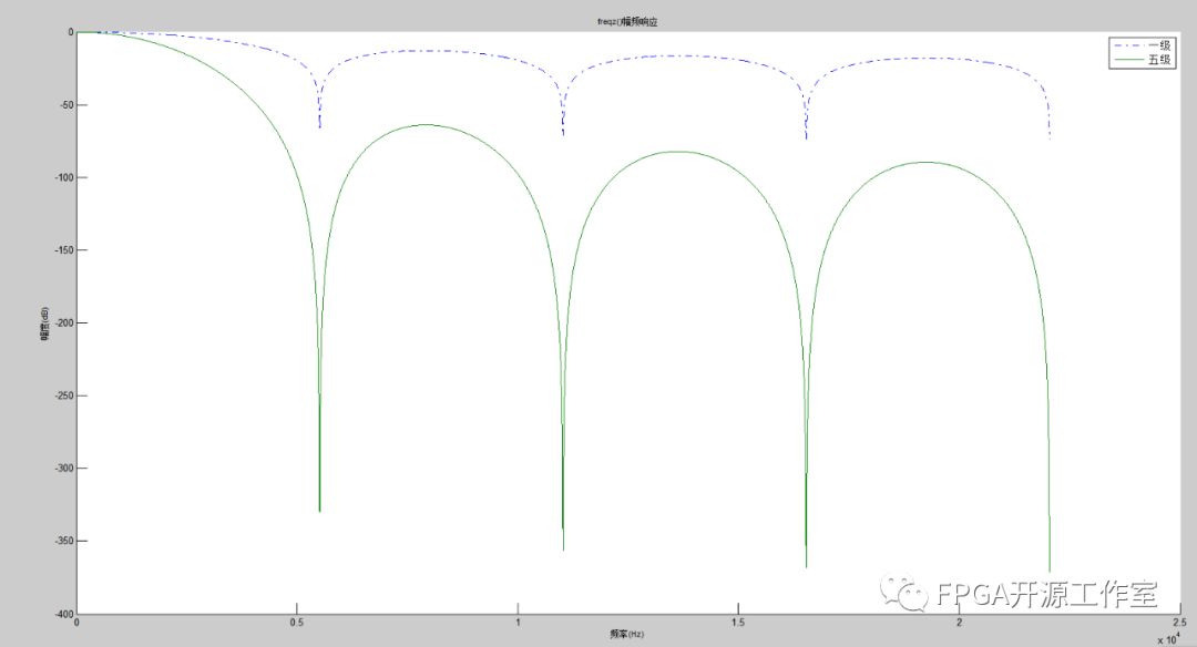 圖6 五級(jí)積分梳狀濾波器串聯(lián)幅頻響應(yīng)