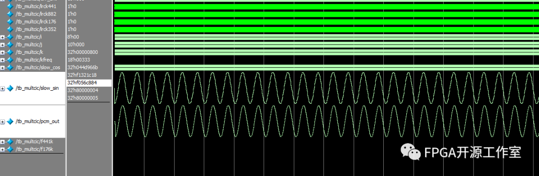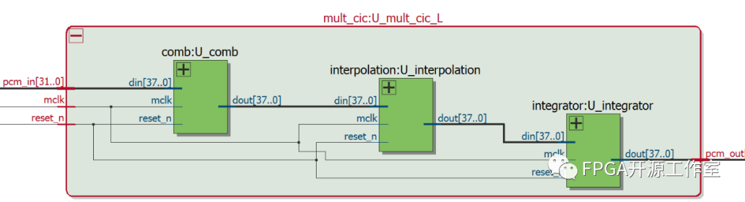 `timescale 1ps/1psmodule mult_cicinput mclk,//45.1584MHZinput reset_n,input signed[31:0] pcm_in,//44.1khzoutput signed[31:0] pcm_out //176.4khz);wire signed [DW-1:0] temp;wire signed [DW-1:0]integrator_temp;wire signed [DW-1:0] interpolation_temp;wire signed [DW-1:0] comb_temp;assign temp = {{(DW-32){pcm_in[31]}},pcm_in};combU_comb(.mclk(mclk),.reset_n(reset_n),.din(temp),.dout(comb_temp));interpolationU_interpolation(.mclk(mclk),.reset_n(reset_n),.din(comb_temp),.dout(interpolation_temp));integratorU_integrator(.mclk(mclk),.reset_n(reset_n),.din(interpolation_temp),.dout(integrator_temp));//divideassign pcm_out = integrator_temp[35:4];endmodule