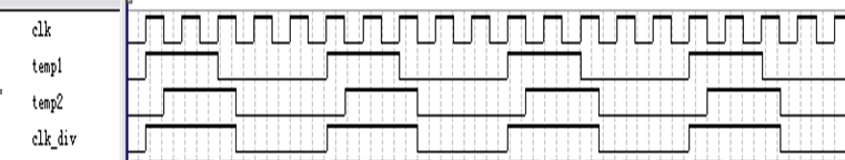 另外一種做法是想得到接近50%的占空比,例如5分頻得到3個(gè)高電平,2.5個(gè)低電平,其思路是控制clk,使得計(jì)數(shù)器值等于某一值只保持半個(gè)周期。參考[3]