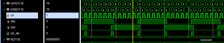 Verilog:N為偶數(shù),使用一個(gè)計(jì)數(shù)器循環(huán)0-(N-1)進(jìn)行計(jì)數(shù),在N/2-1與N-1分別將輸出取反,即完成了N分頻。