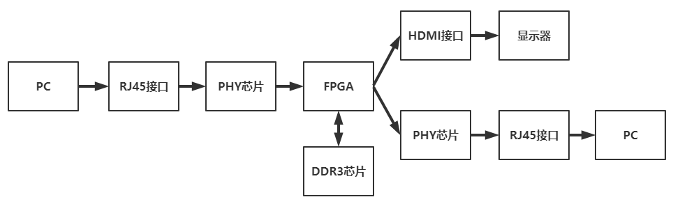 電腦上位機(jī)將一幅 1024*768 圖片通過(guò)雙絞線(網(wǎng)線),發(fā)送給板卡網(wǎng)口(RJ45接口),RJ45接口將數(shù)據(jù)傳輸給網(wǎng)卡(PHY芯片),PHY 芯片將差分信號(hào)轉(zhuǎn)換成雙沿?cái)?shù)據(jù),IDDR將雙沿?cái)?shù)據(jù)轉(zhuǎn)換成單沿?cái)?shù)據(jù)傳輸給 FPGA,F(xiàn)PGA 處理完成后將圖像數(shù)據(jù)緩存到DDR3 中,DDR3 中的圖像數(shù)據(jù)使用 UDP 協(xié)議傳回 PC 機(jī),同時(shí)將 DDR3 中數(shù)據(jù)使用 HDMI 傳輸?shù)斤@示器上。