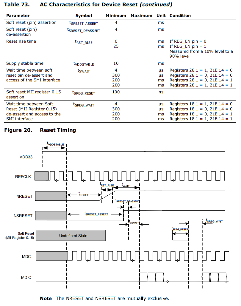 由圖可以看到 PHY Address 有 A0 - A4 共 5 bit,故一個(gè)處理器最多可以掛載這樣的 PHY 芯片 2^5=32 個(gè)。用戶(hù)可通過(guò)配置 PHY Address 或 Resgister Address 將該芯片按需配置。