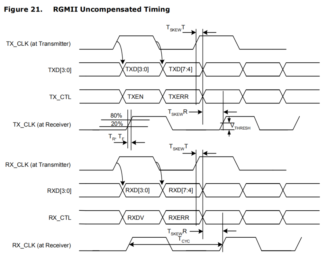 觀察圖中 RX_CLK(at Transmitter) 和 RX_CLK(at Receiver),RX_CLK(at Transmitter)為 HPY 時(shí)鐘,在上升沿時(shí)對(duì)應(yīng)輸出數(shù)據(jù)為 RXD[3:0] 和 RXDV,在下降沿時(shí)對(duì)應(yīng)出數(shù)據(jù)為 RXD[7:4] 和 RXERR,及一個(gè)時(shí)鐘周期對(duì)應(yīng) 8bit 數(shù)、一個(gè)有效使能和一個(gè)錯(cuò)誤信號(hào)。RX_CLK(at Receiver) 是在 RX_CLK(at Transmitter) 的基礎(chǔ)上相移 90°左右而得,這樣采集到的數(shù)據(jù)會(huì)更加穩(wěn)定。