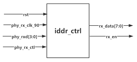 根據(jù)硬件電路圖,PHY 傳輸給 FPGA 有一條時(shí)鐘線、一條使能線和四條數(shù)據(jù)線,其中使能線和數(shù)據(jù)線都為雙沿?cái)?shù)據(jù)。一條使能線包含了 DV 和 ERR,其中上升沿傳輸?shù)氖?DV 信號(hào)(即數(shù)據(jù)有效信號(hào)),下降沿傳輸?shù)臑?ERR 信號(hào)(即數(shù)據(jù)出錯(cuò)信號(hào),通常情況下不考慮 ERR,ERR 是由硬件引起,和軟件無(wú)關(guān));四條數(shù)據(jù)線包含了一個(gè)始終 8bit 數(shù)據(jù),其中上升沿傳輸?shù)氖?8bit 數(shù)據(jù)中的[3:0],下降沿傳輸?shù)氖?8bit 數(shù)據(jù)中的[7:4]。 我們采用 IDDR 原語(yǔ)將雙沿 4bit 數(shù)據(jù)轉(zhuǎn)換為 8bit 數(shù)據(jù),同時(shí)將 8bit 數(shù)據(jù)對(duì)應(yīng)有效 DV 信號(hào)提取。那么可以建立實(shí)現(xiàn)雙沿轉(zhuǎn)單沿功能的模塊:iddr_ctrl,其中輸入與輸出關(guān)系圖如下所示。PHY 芯片傳輸來(lái)的 phy_rxd 和 phy_rx_ctl 都和 PHY 的時(shí)鐘同步。圖中 phy_rx_clk_90 為輸入的時(shí)鐘信號(hào)是 PHY 時(shí)鐘相移90度后形成的,目的是采集 phy_rx_rxd 和 phy_rx_ctl 更穩(wěn)定,rx_data 和 rx_en 即為該模塊輸出的單沿 8bit 數(shù)據(jù)和對(duì)應(yīng)的數(shù)據(jù)有效使能。