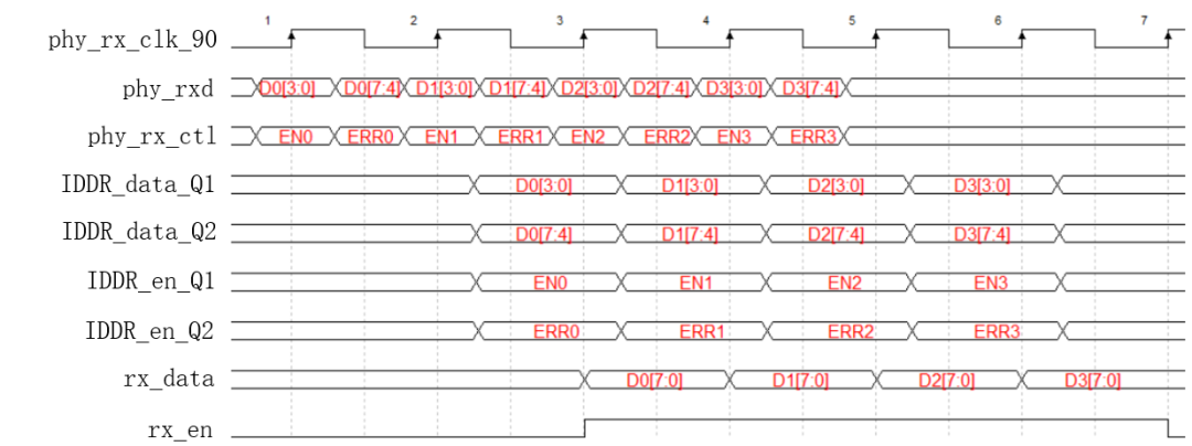 千兆以太網(wǎng)數(shù)據(jù)傳輸經(jīng)過(guò) IDDR 后 8bit 數(shù)據(jù) rx_data 與使能 rx_en 對(duì)應(yīng)關(guān)系如下圖所示。