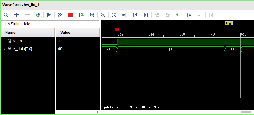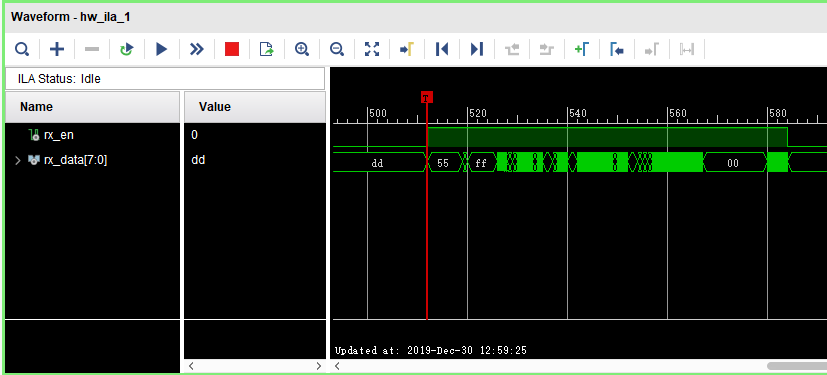 查看 ila,將 rx_en 的上升沿作為觸發(fā)信號(hào),得到如下波形: