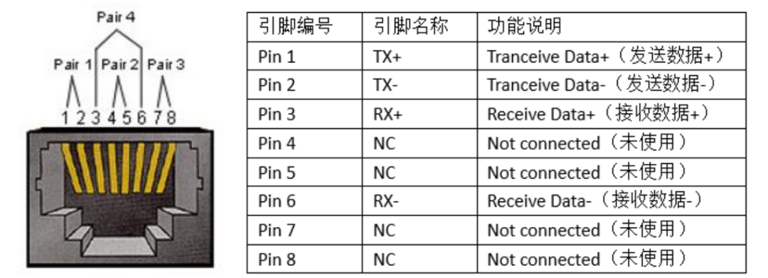 RJ45接口定義以及各引腳功能說(shuō)明如下圖所示,在以太網(wǎng)中只使用了1、2、3、6這四根線,其中1、2這組負(fù)責(zé)傳輸數(shù)據(jù)(TX+、TX-),而3、6這組負(fù)責(zé)接收數(shù)據(jù)(RX+、RX-),另外四根線是備用的。