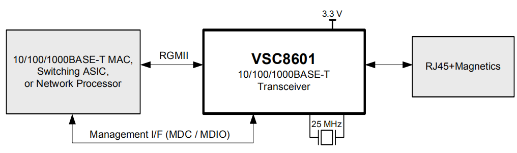 本項(xiàng)目使用 VITESSE VSC8601 網(wǎng)卡芯片,該芯片支持 10/100/1000 BASE-T,常用的網(wǎng)卡芯片有 VITESSE、高通等公司產(chǎn)品,該芯片通稱(chēng)為 PHY 芯片。該芯片與我們電腦、FPGA、MCU 等微處理器通信必須遵循 RGMII 協(xié)議。