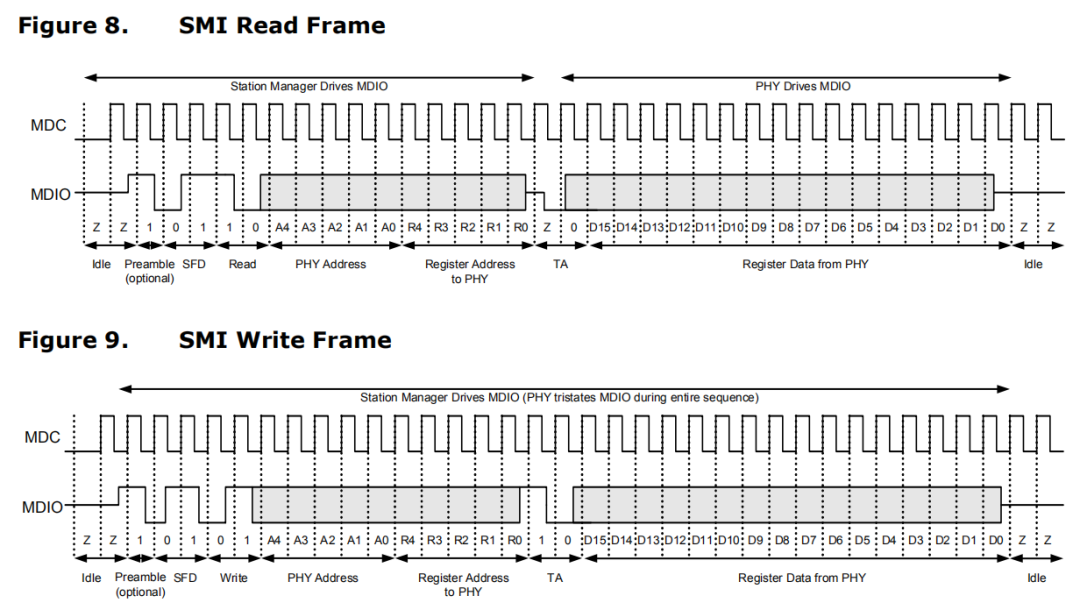 VSC8601 設(shè)備包含一個(gè) IEEE 802.3 兼容的串行管理接口(SMI),其中 MDC 和 MDIO 可對(duì)該芯片進(jìn)行控制。SMI 提供了訪問(wèn)權(quán)限設(shè)備控制和狀態(tài)寄存器??刂?SMI 的寄存器集由 32 個(gè) 16 位寄存器組成,包括所有需要的 IEEE 指定寄存器。此外,通過(guò)設(shè)備寄存器 31 可以訪問(wèn)寄存器的附加寄存器。SMI 是一個(gè)同步串行接口,其配置方式和 IIC 類(lèi)似,MDIO 引腳具有有雙向數(shù)據(jù),在 MDC 信號(hào)的上升邊緣上采集。MDC 采集速度應(yīng)在 0 MHz 到 25mhz。數(shù)據(jù)通過(guò) SMI 使用具有可選和任意長(zhǎng)度前導(dǎo)的 32 位幀傳輸,下圖(文檔26頁(yè))顯示了用于讀操作和寫(xiě)操作的SMI框架格式。