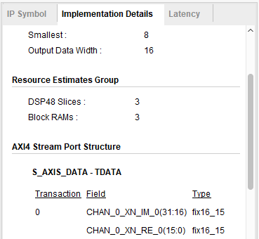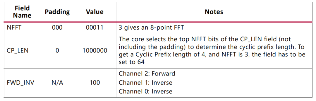 內(nèi)核具有可配置的轉(zhuǎn)換大小,最大大小為128點(diǎn),具有循環(huán)前綴插入和3個(gè)FFT通道。內(nèi)核需要配置為執(zhí)行8點(diǎn)變換,并在通道0和1上執(zhí)行逆變換,并在通道2上執(zhí)行前向變換。需要4點(diǎn)循環(huán)前綴。這些字段采用表中的值。