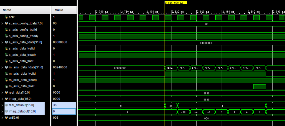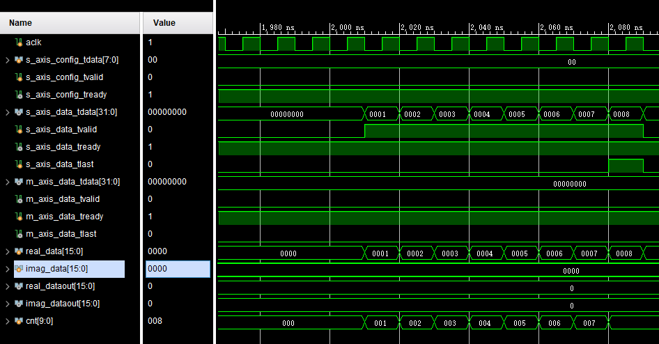 1ns / 1ps module tb_fft_top( ); reg aclk; reg [7 : 0] s_axis_config_tdata; reg s_axis_config_tvalid; wire s_axis_config_tready; wire [31 : 0] s_axis_data_tdata; reg s_axis_data_tvalid; wire s_axis_data_tready; reg s_axis_data_tlast; wire [31 : 0] m_axis_data_tdata; wire m_axis_data_tvalid; reg m_axis_data_tready; wire m_axis_data_tlast; reg [15:0] real_data; reg [15:0] imag_data; wire [15:0] real_dataout; wire [15:0] imag_dataout; reg [9:0] cnt; assign s_axis_data_tdata={real_data,imag_data}; assign real_dataout = m_axis_data_tdata[31:16]; assign imag_dataout = m_axis_data_tdata[15:0]; initial begin aclk = 0; s_axis_config_tdata=8'b0; s_axis_config_tvalid=1'b0; s_axis_data_tvalid=1'b0; s_axis_data_tlast=1'b0; real_data=16'd0; imag_data=16'd0; cnt = 0; m_axis_data_tready=1'b1; #1000; s_axis_config_tdata=8'b0000_0001; s_axis_config_tvalid=1'b1; #10; s_axis_config_tdata=8'b0000_0000; s_axis_config_tvalid=1'b0; #1000; repeat(8)begin s_axis_data_tvalid=1'b1; real_data=real_data+16'd1; cnt=cnt+1; ==8) s_axis_data_tlast=1'b1; #10; end s_axis_data_tvalid=1'b0; s_axis_data_tlast=1'b0; real_data=16'd0; #1000; $stop; end always #(5) aclk= ~aclk;fft_top Ufft_top( // input wire aclk // input wire [7 : 0] s_axis_config_tdata // input wire s_axis_config_tvalid // output wire s_axis_config_tready // input wire [31 : 0] s_axis_data_tdata // input wire s_axis_data_tvalid // output wire s_axis_data_tready // input wire s_axis_data_tlast // output wire [31 : 0] m_axis_data_tdata // output wire m_axis_data_tvalid // input wire m_axis_data_tready // output wire m_axis_data_tlast );endmodule