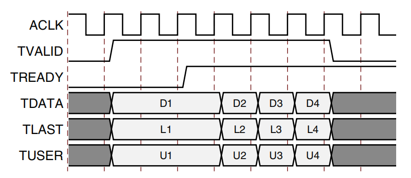 圖2顯示了在AXI4-Stream通道中的數(shù)據(jù)傳輸。TVALID由通道的源(主)端驅(qū)動(dòng),而TREADY由接收器(從屬)驅(qū)動(dòng)。TVALID指示有效負(fù)載字段(TDATA,TUSER和TLAST)中的值有效。TREADY表示從機(jī)已準(zhǔn)備好接收數(shù)據(jù)。當(dāng)一個(gè)周期中的TVALID和TREADY均為TRUE時(shí),將發(fā)生傳輸。主機(jī)和從機(jī)分別為下一次傳輸分別設(shè)置TVALID和TREADY。