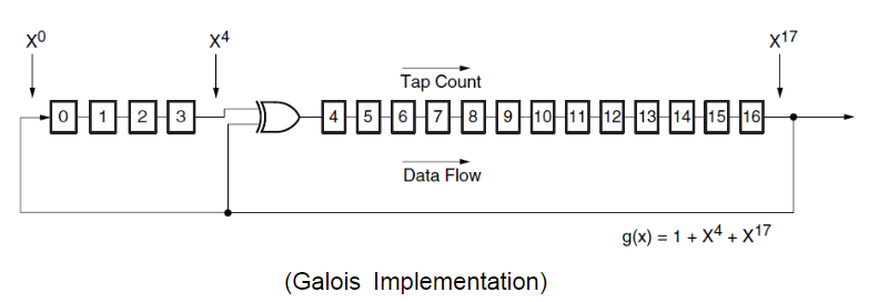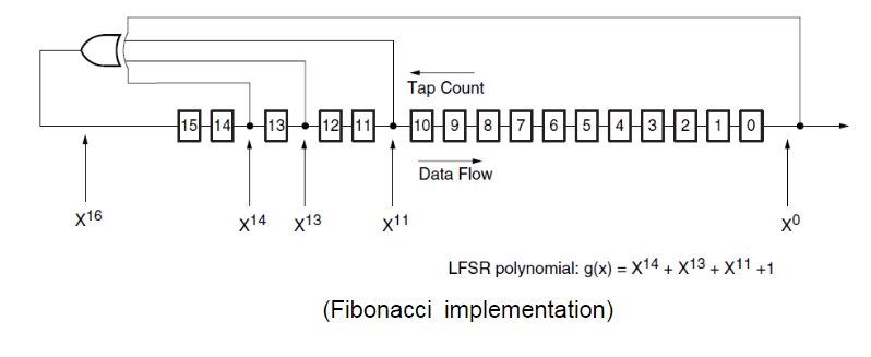 從圖中我們可以看到Fibonacci方式的數(shù)學(xué)流向和反饋形式是恰好跟Galois方式相反的,按照本原多項(xiàng)式,其中X^0這一項(xiàng)作為最后一項(xiàng),這里需要一個XOR門,將本原多項(xiàng)式中所給的taps來設(shè)定它的異或方式。因此Fibonacci方式也被叫做線外或者簡型(S-型)LFSR。