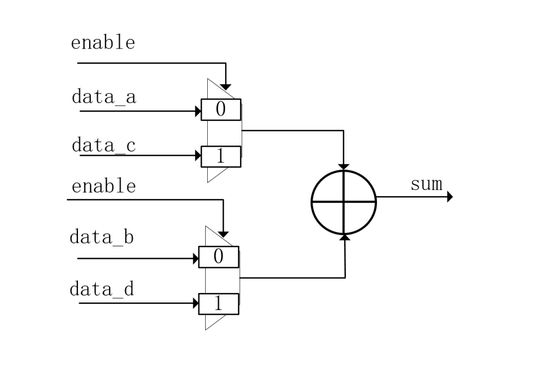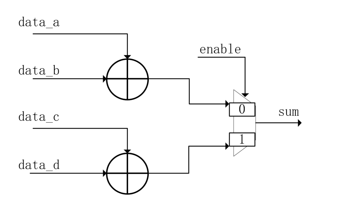 assign sum[4:0] = enable ? (data_a + data_b) : (data_c + data_d); assign add_a[3:0] = enable ? data_a : data_c;assign add_b[3:0] = enable ? data_b : data_d;assign sum[4:0] = add_a + add_b;