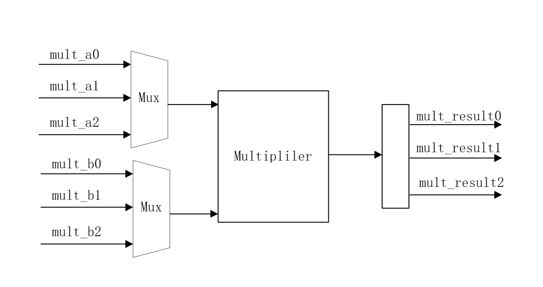 圖中的加法器可以替換成,比較器,乘法器,一個運算單元,甚至巨大的一個模塊。乘法器時分復(fù)用在計算模塊中乘法器也是非常大的一部分邏輯,一個設(shè)計要考慮PPA最優(yōu),一個必須要考慮乘法器的數(shù)量多少以及復(fù)用能不能最大化,追求最好的設(shè)計是整個數(shù)據(jù)通路中乘法器空閑不下來。通常的設(shè)計是做一個專門的乘法器模塊,按系統(tǒng)最大的位寬開辟乘法器位寬邏輯,根據(jù)設(shè)計流程最大程度上復(fù)用乘法器資源。