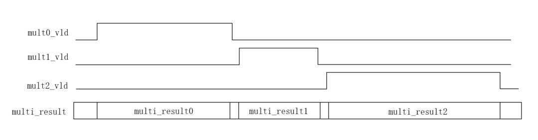 每一路乘法配備一個vld,用vld來作為當(dāng)前有效的乘法運算,乘法器的結(jié)果隨著vld的下一拍進(jìn)行鎖存。從下圖可以看出乘法器的復(fù)用需要將各個部分的運算時間區(qū)分開,不可避免系統(tǒng)的時間會變長,想要縮短時間則可以用更多的乘法器來大幅縮短時間,想要面積更小,則用更少的乘法器資源來時分復(fù)用。面積與速度互換思想核心。