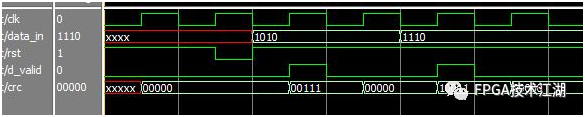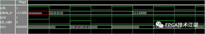 仿真結果如下:得到的是數(shù)據(jù)0xaa和0xf0的CRC校驗碼,為驗證結果的正確性,可以按照模2法則手工計算一下。