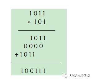 多位二進制模2乘法類似于普通意義上的多位二進制乘法,不同之處在于后者累加中間結果時采用帶進位的加法,而模2乘法對中間結果的處理方式采用的是模2加法。例如1011×101=100111,列豎式計算: