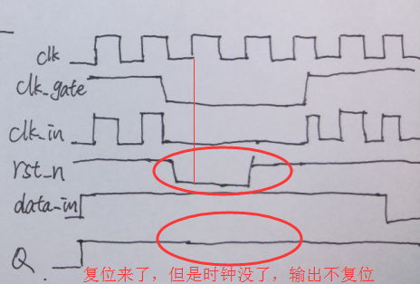 使用門控時(shí)鐘的時(shí)候,由于復(fù)位信號依賴于時(shí)鐘,在復(fù)位信號發(fā)出的時(shí)候,時(shí)鐘可能關(guān)閉了,這個(gè)時(shí)候就會導(dǎo)致實(shí)際的電路沒有被復(fù)位,如下圖所示: