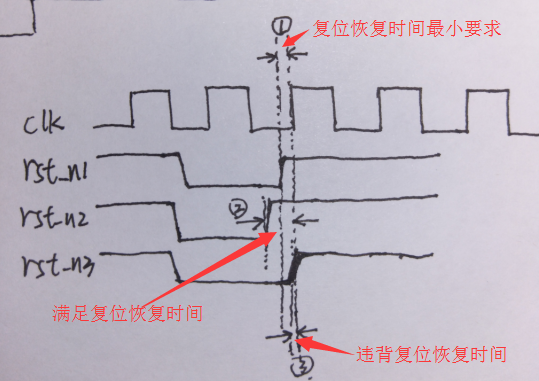 上圖中,rst_n1是要求的復(fù)位恢復(fù)時(shí)間,rst_n2滿足復(fù)位恢復(fù)時(shí)間,rst_n3復(fù)位恢復(fù)時(shí)間不足。
