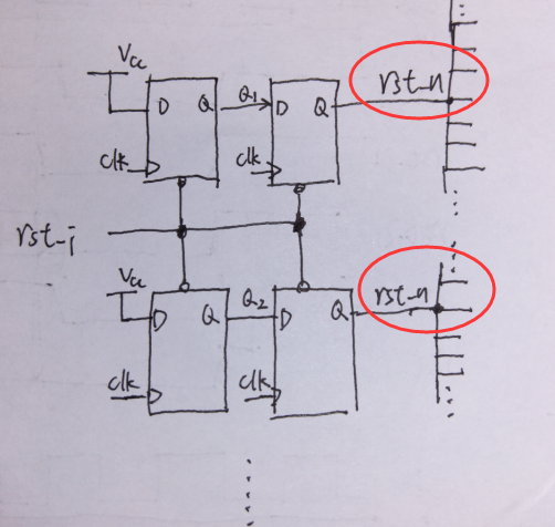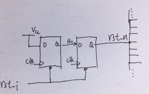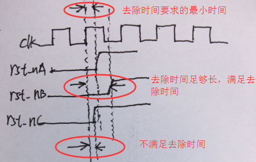 上圖中,rst_nA是要求的復(fù)位去除時(shí)間,rst_n2滿足復(fù)位去除時(shí)間,rst_n3復(fù)位去除時(shí)間不足。