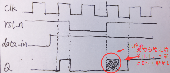 ·當(dāng)異步復(fù)位信號的撤離時(shí)刻在時(shí)鐘有有效沿附近時(shí),就可能導(dǎo)致恢復(fù)時(shí)間或去除時(shí)間不足,即這個(gè)時(shí)候違背了復(fù)位恢復(fù)時(shí)間或去除時(shí)間,這時(shí)就可能導(dǎo)致觸發(fā)器的輸出端為亞穩(wěn)態(tài)(注意是可能),如下所示: