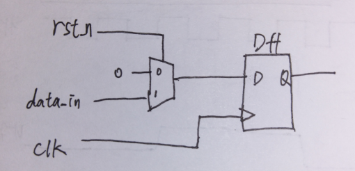 同步復(fù)位是指復(fù)位信號在時(shí)鐘有效沿到來時(shí)才復(fù)位電路(主要是復(fù)位觸發(fā)器)。因此同步復(fù)位的復(fù)位信號受到時(shí)鐘信號的控制。同步復(fù)位的觸發(fā)器RTL代碼和電路如下所示:
