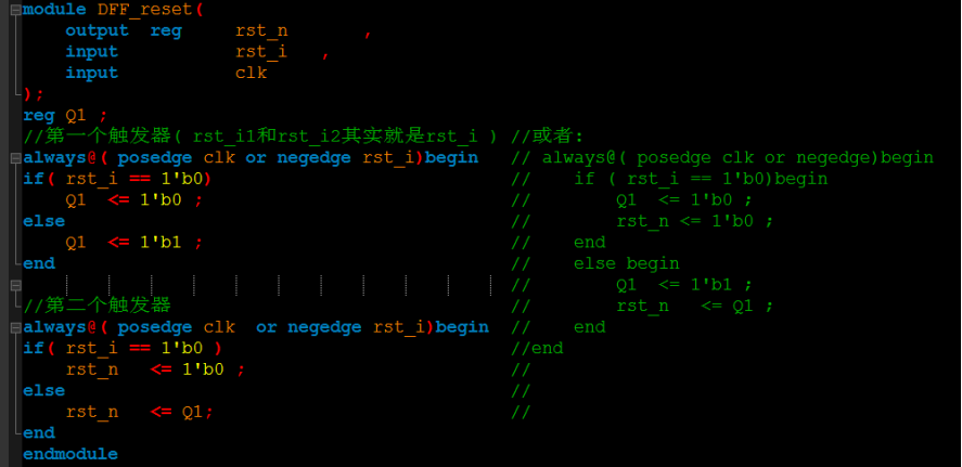 解決方法就是:一方面這個(gè)只是綜合工具的問題,一般綜合工具會自動識別在敏感列表里面又在條件表達(dá)式信號中的第一個(gè)信號為復(fù)位信號;另一方面,可以在RTL代碼編寫的時(shí)候,加入相關(guān)的綜合指令,讓綜合的時(shí)候把復(fù)位邏輯靠近觸發(fā)器。