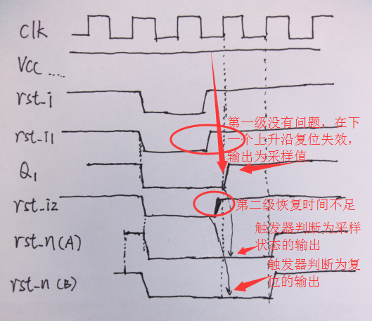 最極端的一種情況是,兩級的撤離都不滿足復(fù)位恢復(fù)時(shí)間或者去除時(shí)間,這時(shí)候的時(shí)序圖如下所示: