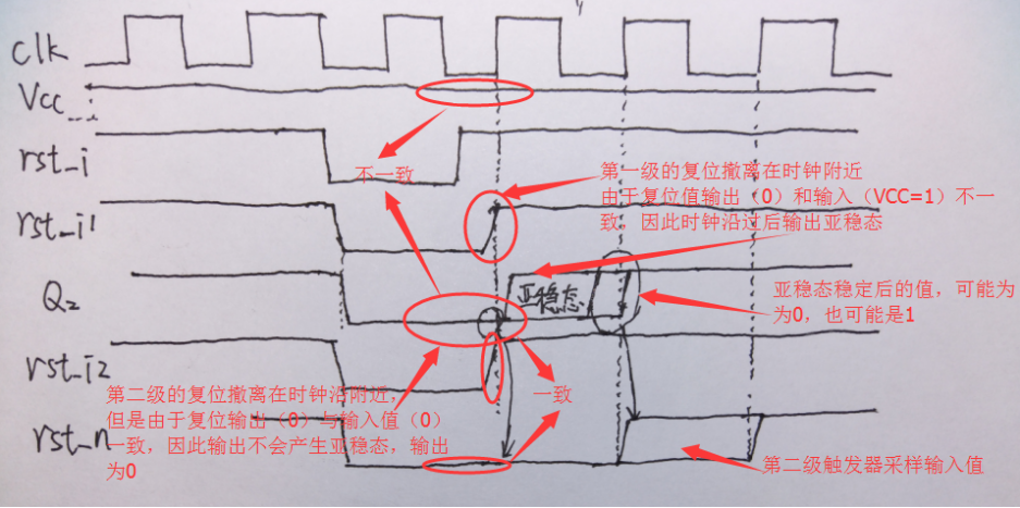 然而這種方案還是有問題的,這是第一級的撤離出現(xiàn)問題,第二級的撤離沒有問題的時(shí)候,亞穩(wěn)態(tài)穩(wěn)定后的狀態(tài)可能不一樣,導(dǎo)致rst_n的復(fù)位不一致,有的復(fù)位可能會快/慢一個(gè)周期。