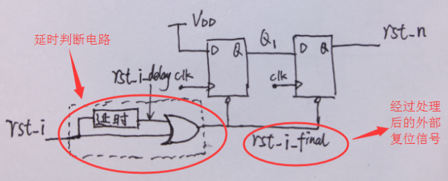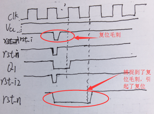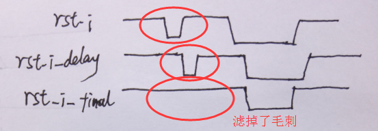 解決方法:一個(gè)是使用同步復(fù)位,另一個(gè)就是過濾毛刺了,過濾毛刺和消抖的思路有點(diǎn)像,主要就是經(jīng)過一段延時(shí)之后,在經(jīng)過邏輯門判斷產(chǎn)生外部來的是不是真正復(fù)位信號,加上過濾毛刺信號部分的同步撤離電路和時(shí)序如下所示: