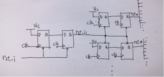 在數(shù)字電路里面,復(fù)位信號驅(qū)動了很多觸發(fā)器,僅次于時(shí)鐘,因此復(fù)位也往往形成或者使用復(fù)位網(wǎng)絡(luò)。復(fù)位網(wǎng)絡(luò)的設(shè)計(jì)也是有值得斟酌的地方,例如,由于復(fù)位的扇出太大,全部的復(fù)位不能僅僅由一個(gè)端口驅(qū)動,也就是不能像下面一樣: