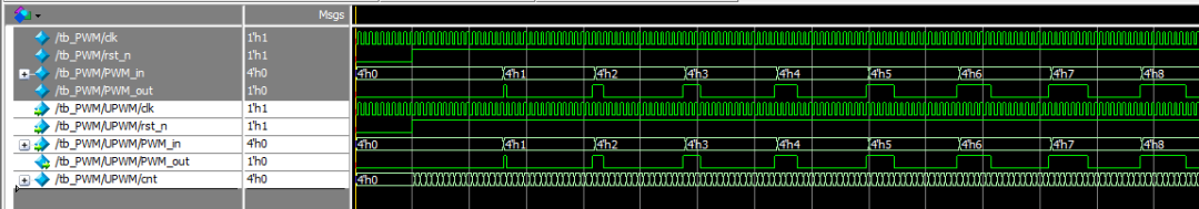 module PWM( input clk, input rst_n, input [3:0] PWM_in, output PWM_out); reg [3:0] cnt;always @(posedge clk or negedge rst_n) if(!rst_n) =0; else cnt <= cnt + 1'b1; // free-running counter assign PWM_out = (PWM_in > cnt)?1'b1:1'b0; // comparatorendmodule