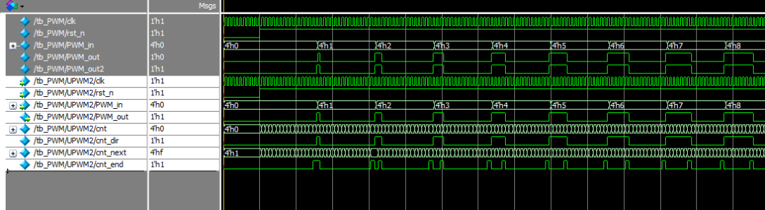 module PWM2( input clk, input rst_n, input [3:0] PWM_in, output PWM_out); reg [3:0] cnt;reg cnt_dir; // 0 to count up, 1 to count downwire [3:0] cnt_next = cnt_dir ? cnt-1'b1 : cnt+1'b1;wire cnt_end = cnt_dir ? cnt==4'b0000 : cnt==4'b1111; always @(posedge clk or negedge rst_n ) if(!rst_n) cnt <= 0; else cnt <= cnt_end ? PWM_in : cnt_next;always @(posedge clk or negedge rst_n) if(!rst_n) =1'b0; else cnt_dir <= cnt_dir ^ cnt_end;assign PWM_out = cnt_dir;endmodule
