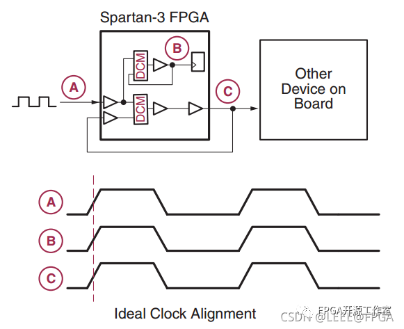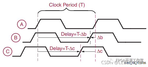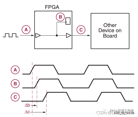 例如,考慮將時(shí)鐘信號(hào)從節(jié)點(diǎn) A 分配到節(jié)點(diǎn) B 和 C,如下面的圖 1 所示。在該圖中,時(shí)鐘信號(hào)進(jìn)入FPGA,經(jīng)過緩沖器(圖中的三角形),然后到達(dá)節(jié)點(diǎn)B的寄存器。該路徑具有固有延遲,在波形中用Δb表示。為了將時(shí)鐘從 A 分配到 C,我們可以使用 PCB 走線而不通過 FPGA,但在圖中,F(xiàn)PGA 中分配的時(shí)鐘用于“板上的其他設(shè)備”。該路徑的延遲由Δc表示。由于 Δb 和 Δc 通常不相等,因此節(jié)點(diǎn) B 的寄存器和節(jié)點(diǎn) C 的設(shè)備會(huì)看到略有不同的時(shí)鐘;應(yīng)該具有對(duì)齊邊沿的相同時(shí)鐘之間的這種固定時(shí)間偏移稱為時(shí)鐘偏差。我們可以看到,數(shù)字設(shè)計(jì)中的一個(gè)嚴(yán)重問題是以盡可能小的時(shí)鐘偏差在系統(tǒng)中分配高扇出時(shí)鐘信號(hào)。
