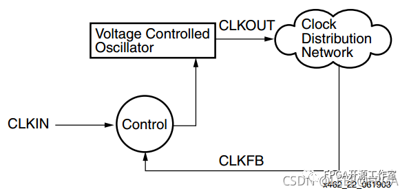 在這種情況下,使用“電壓控制振蕩器”代替“可變延遲線”。反饋回路調(diào)整振蕩器的頻率,使兩個(gè)時(shí)鐘信號(hào) CLKIN 和 CLKFB 具有對(duì)齊的邊沿。