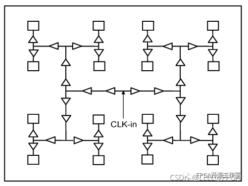 您可以輕松驗(yàn)證從 CLK-in 到每個(gè)矩形(代表時(shí)鐘元素)是否有類似的路徑。因此,理論上,所有時(shí)鐘元件將看到相同的時(shí)鐘信號(hào)。圖 7 顯示了一些英特爾 FPGA 用于分配全局時(shí)鐘信號(hào) (GCLK) 的 H 樹。