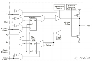 在《IO輸入輸出的各種模式》介紹了處理器IO的各種輸入輸出模式以及原理,那么FPGA的IO是什么樣的結(jié)構(gòu)和原理?圖 1為Xilinx文檔中提供的IOB的內(nèi)部結(jié)構(gòu),可以看出: