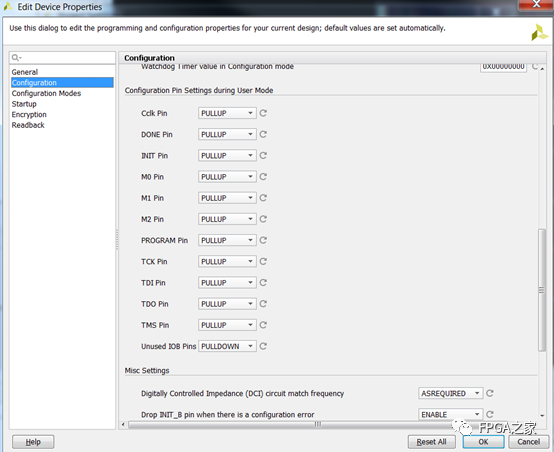 第二類(lèi)是在用戶(hù)設(shè)計(jì)配置中沒(méi)有要求保留其特殊功能,這些引腳在配置完成之后會(huì)變成普通IO,且在用戶(hù)設(shè)計(jì)中沒(méi)有使用到的IO。這些IO相當(dāng)于Unassigned IO,如前所述,這些IO在配置完成之后的狀態(tài)受到相應(yīng)設(shè)置的影響,可以是上拉、下拉或者Floating。