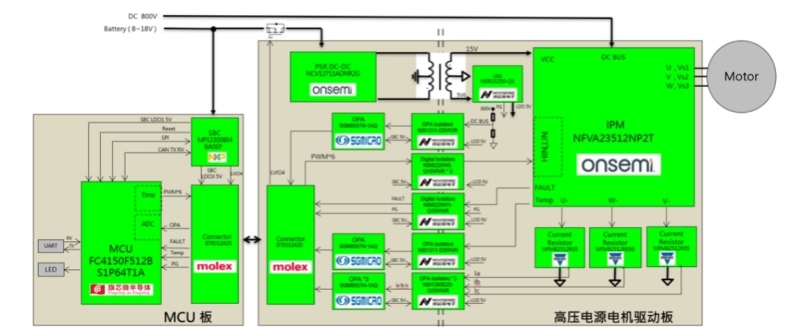 在全球“雙碳”目標(biāo)驅(qū)動下,新能源汽車產(chǎn)業(yè)正以年均超40%的增速重塑汽車工業(yè)格局。并且隨著800V高壓平臺、熱泵空調(diào)等技術(shù)的普及,作為汽車核心部件的空壓機(e-Compressor)性能需求迅速攀升,其能效比與可靠性可能會直接影響整車的續(xù)航能力和駕乘體驗。面對這一趨勢,大聯(lián)大世平推出以旗芯微FC4150F512BS1P64T1A MCU為主,搭載NXP SBC芯片MFS2300BMBA0EP、onsemi IPM模塊NFVA23512NP2T、PSR DC/DC NCV12711ADNR2G器件、圣邦微運算放大器SGM8557H-1AQ、納芯微隔離器NSI8220W0、NSI1311和NSI1300D25、Molex連接器以及Vishay電阻器的新能源汽車e-Compressor空壓機方案。