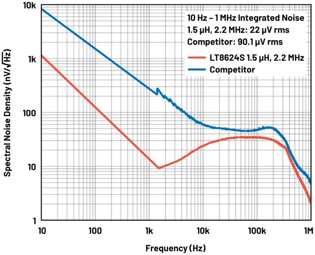 客戶的應(yīng)用對(duì)10 Hz至1 MHz頻率范圍內(nèi)的噪聲較為敏感,這一點(diǎn)必須考慮在內(nèi)。在這個(gè)頻率范圍內(nèi),所需的積分噪聲應(yīng)低于25 μV rms。使用頻譜分析儀和放大器就可以輕松測(cè)量這個(gè)噪聲范圍。對(duì)上述設(shè)計(jì)的解決方案進(jìn)行測(cè)試后發(fā)現(xiàn),10 Hz至1 MHz的積分噪聲為22 μV rms,低于客戶的最低要求。為了進(jìn)行對(duì)比,對(duì)最接近SS3的競(jìng)品進(jìn)行了測(cè)試,在相同測(cè)試條件下(包括使用相同的電感器、輸出電容及開(kāi)關(guān)頻率)測(cè)得競(jìng)品的積分噪聲為90 μV rms。噪聲測(cè)試結(jié)果如圖5所示。