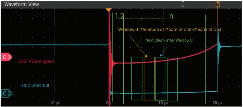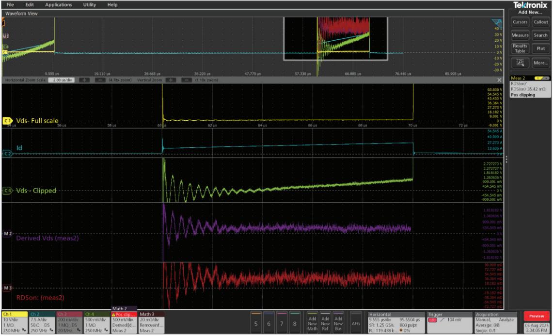 ● 另一個差分探頭僅以高靈敏度捕獲RDS(on)區(qū)域,在FET導(dǎo)通且VDS較小時提供高分辨率。這相當于有意削剪VDS上的信號。注意這種方法類似于使用二極管鉗位電路削剪信號,但需要應(yīng)用校正以獲得良好結(jié)果。