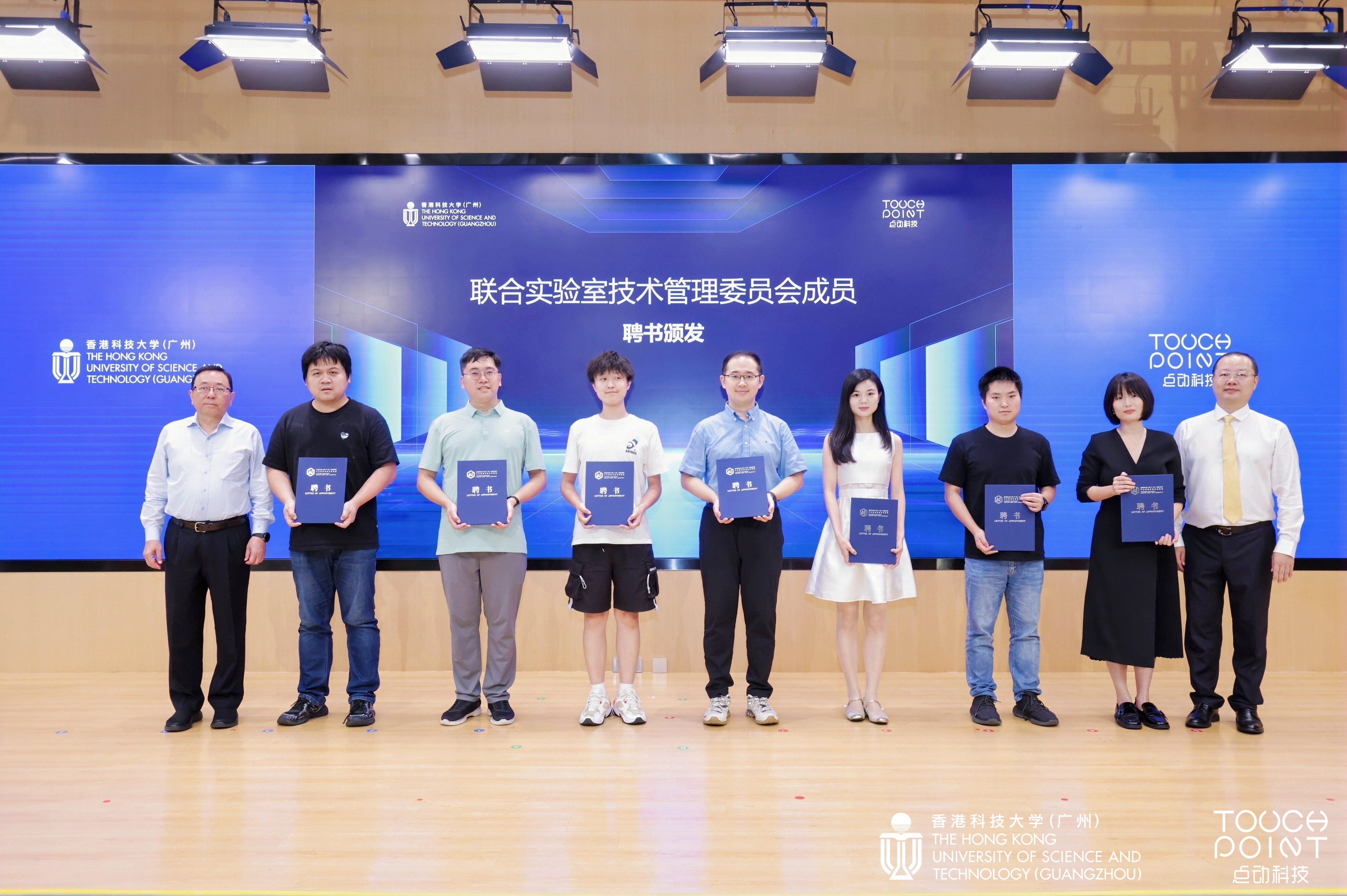 香港科技大學(xué)(廣州)校長(zhǎng)倪明選教授和廣州點(diǎn)動(dòng)信息科技股份有限公司董事長(zhǎng)&總裁陳科斌先生為聯(lián)合實(shí)驗(yàn)室技術(shù)管理委員會(huì)成員頒發(fā)聘書。