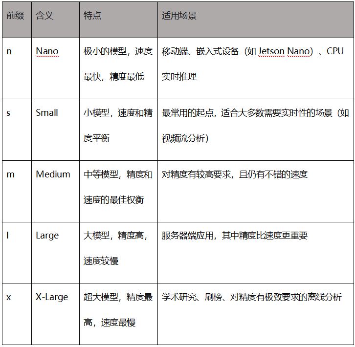 同樣YOLOv8也有很多尾綴,用一個表簡單列一下它們分別代表什么意思: